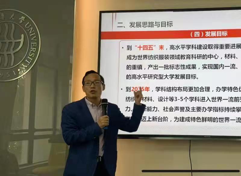 会上,院长宋新山首先带领全体教职工学习了学校“十四五”规划内容。在第十四个五年规划的开局之年,全校上下学习领会好“十四五”规划精神和工作重点是学校的头等大事。宋新山院长从发展基础与环境、发展思路与目标、发展策略与重点、主要任务和举措、发展保障与支撑等五大方面逐条宣讲了学校“十四五”规划内容。到“十四五”末,学校的高水平建设要取得重要进展,学科实力显著增强,成为世界纺织服装领域教育科研的中心,材料、设计等领域教育科研的重镇,产出一批标志性成果,实现国内一流、国际有影响、有特色的高水平研究型大学。
