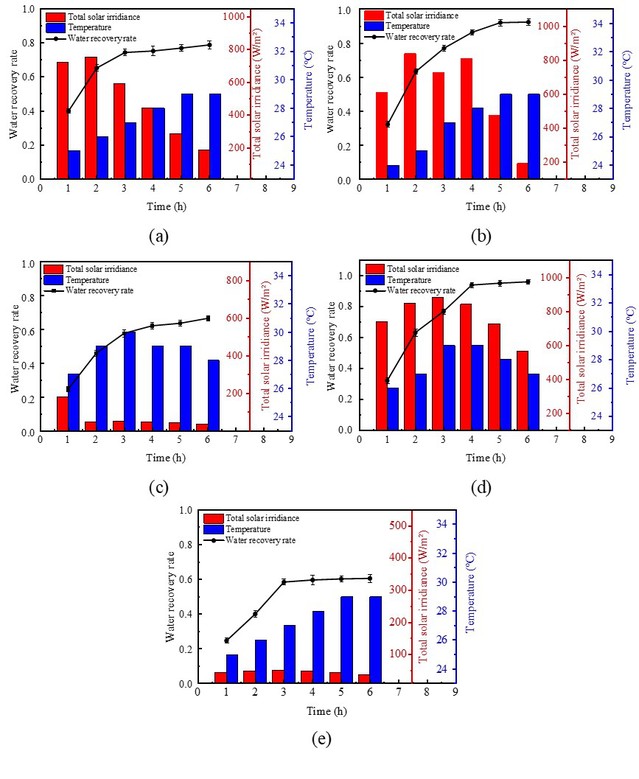 图1空气取水水分收集率曲线:(a)-(e)五条典型逐时水分回收率曲线 |
