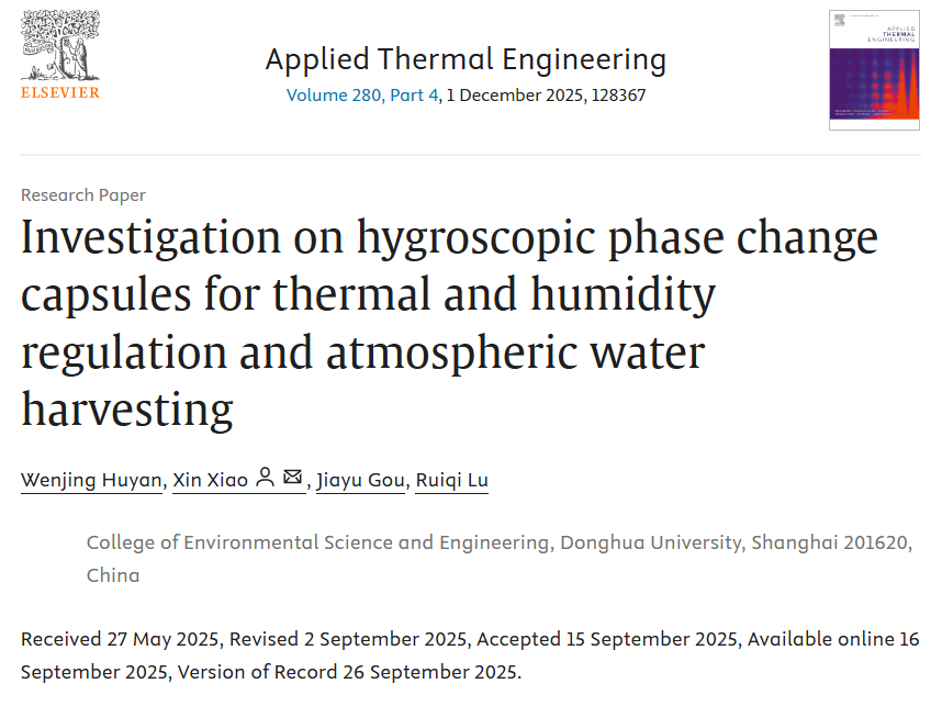 文章链接:Wenjing Huyan, Xin Xiao*, Jiayu Gou, Ruiqi Lu. Investigation on hygroscopic phase change capsules for thermal and humidity regulation and atmospheric water harvesting. Applied Thermal Engineering, 2025, 280: 128367.